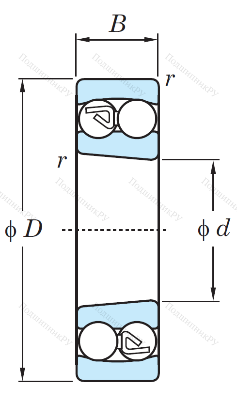 Конструкции этого типа, производящиеся фирмами FAG, KOYO, NSK, SKF, SNR, имеют два ряда шарикоподшипников, внешнюю выпуклую шину и внутреннюю обойму, в которой находится монтажное цилиндрическое отверстие. Воспринимают радиальные и осевые вектора приложения, включая двустороннюю нагрузку по оси (она не должна превышать 20% от лучевой).