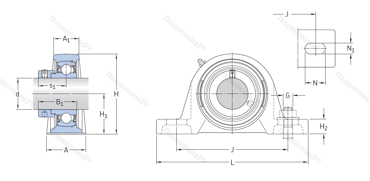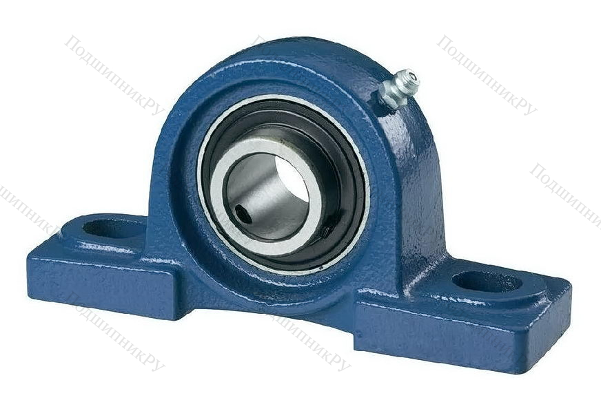 В конструкцию детали входит корпусный подшипник типа UC, установленный в корпус типа Р из чугуна с нишей сферической формы. Монтаж на вал осуществляется посредству кольца, оснащенного парой штифтов, закручиваемых шестигранником, что обеспечивает самовыравнивание.