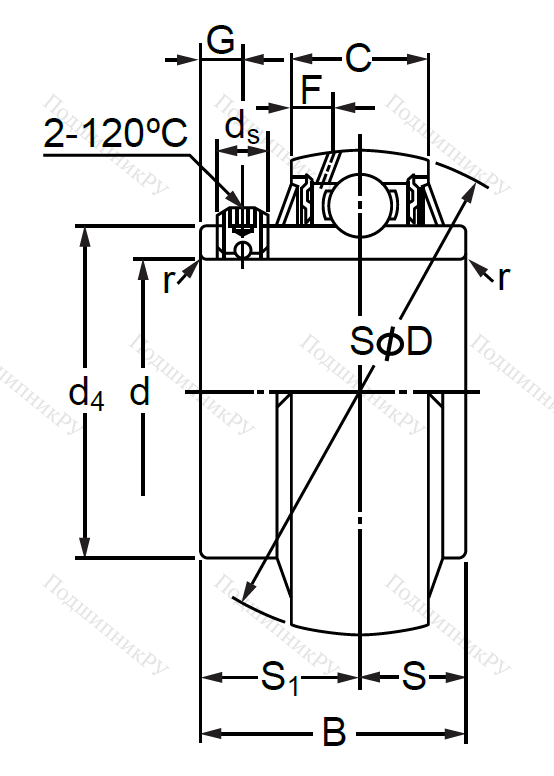 Шариковое радиальное подшипниковое тело, имеющее однорядную конструкцию с расширенной внутренней шиной и двумя уплотнениями. Данное кольцо может выпускаться с различными вариантами крепежа: втулка для закрепления, стопорное эксцентриковое кольцо, винты. Конструкция предназначена для работы совместно с корпусами типов UCP, UCT, UCF, UCPA, UCFL с шириной или высотой подшипника B(H): 103мм.