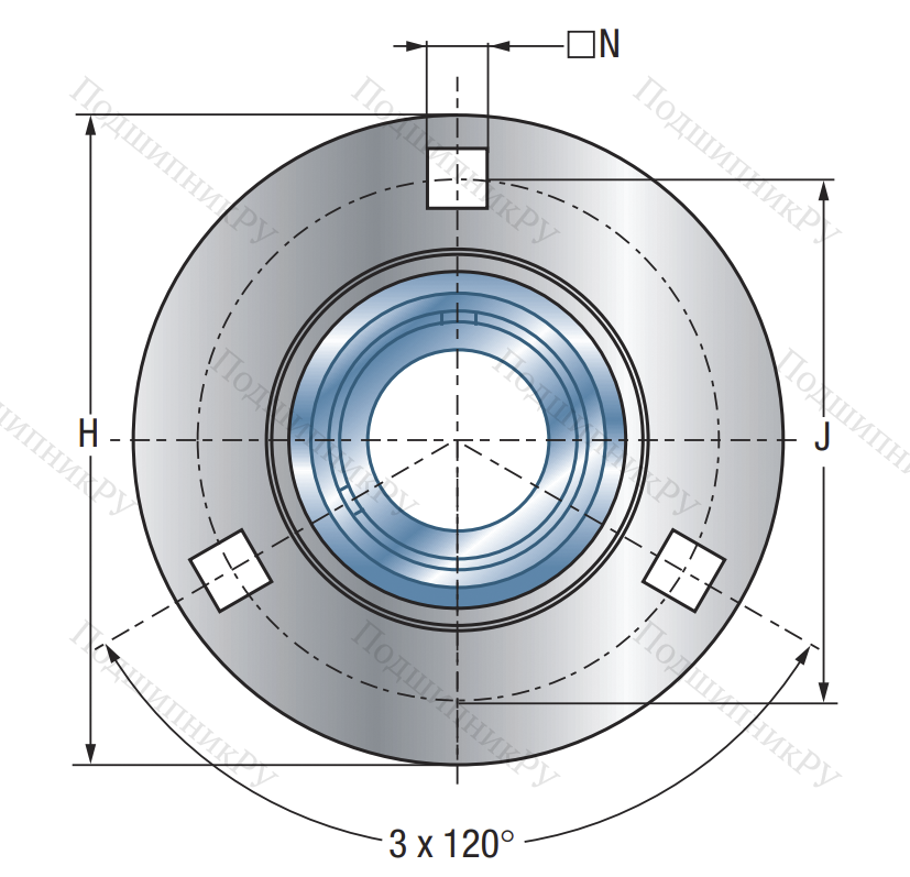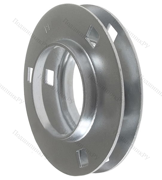 Подшипниковый фланцевый узел, состоящий из двух половин одинаковой формы, включающих три отверстия и изготовленных из штампованной стали толщиной примерно 2 мм. Может размещать в себе однорядные шарикоподшипники типа Y (SB, UC, SA, YAR, HC и другие). Наружная шина – сферической формы, за счет чего происходит самоцентрация, то есть компенсация несоосности и прочих дефектов установки.