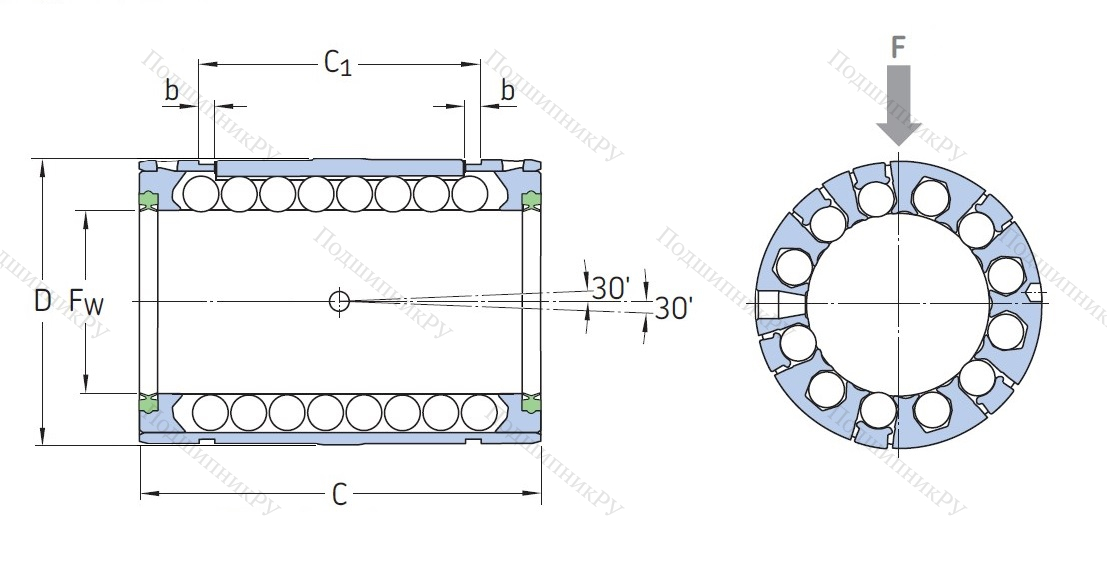 Конструкция шарикового подшипника линейного перемещения включает в себя шесть продольной формы дорожек, удерживающих шарики. Предназначена для работы с валом и совершения продольного и вращательного движения. Наружное кольцо оснащено парой проточек.